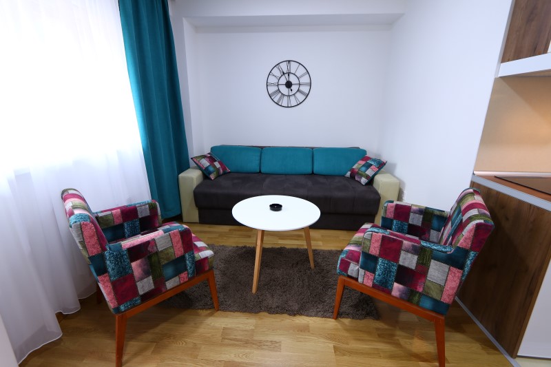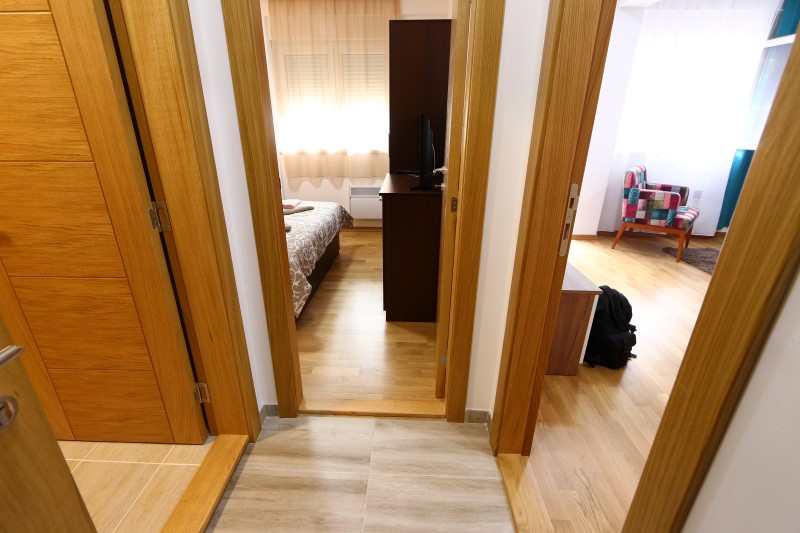 spavaća soba sa bračnim krevetom i TV-om, dnevni boravak sa grofom na razvlačenje, full opremljena kuhinja sa poosudjem, keramička ploča sa dve ravne ringle, kablovska TV, wi-fi internet, kupatilo sa tuš kabinom