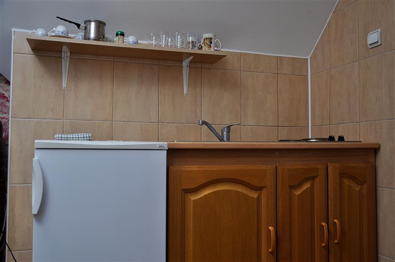 Predsoblje sa plakarom, Dnevni boravak (kauč, stočić, kablovska TV), Kuhinja (kompletno opremljena, pribor za ručavanje, sto za 3 osobe), Spavaća soba (2 kauča, garderober, stočić), Kupatilo (tuš kabina, WC, umivaonik, ogledalo), Balkon