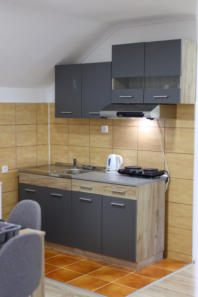 STUDIO PETRA je četvorokrevetni studio od 55 m2 sa velikom terasom. Pored bračnog kreveta (160x200cm) i dva odvojena ležaja (90x200cm) tu je i udobna ugaona garnitura koja se razvlači, tako da će biti komforno i ako vas ima 6. U potpuno opremljenoj kuhinji možete pripremiti ukusne obroke, a za brzo spremanje kafe ili čaja, tu je i ketler. Posebno je lepo kada se jutarnja kafa lagano ispija na velikoj terasi, sa koje se pruža predivan pogled na Ozren, planinu oporavilišta, koja kao da vas poziva da je posetite i uživate u šetnji, svežem vazduhu i mirisima planinskog bilja. A kad se vratite, opijeni čistim vazduhom, možete gledati TV, lutati po internetu ili prosto sedeti na terasi, disati, ćaskati uz čašu vina, neko meze i tihu muziku.